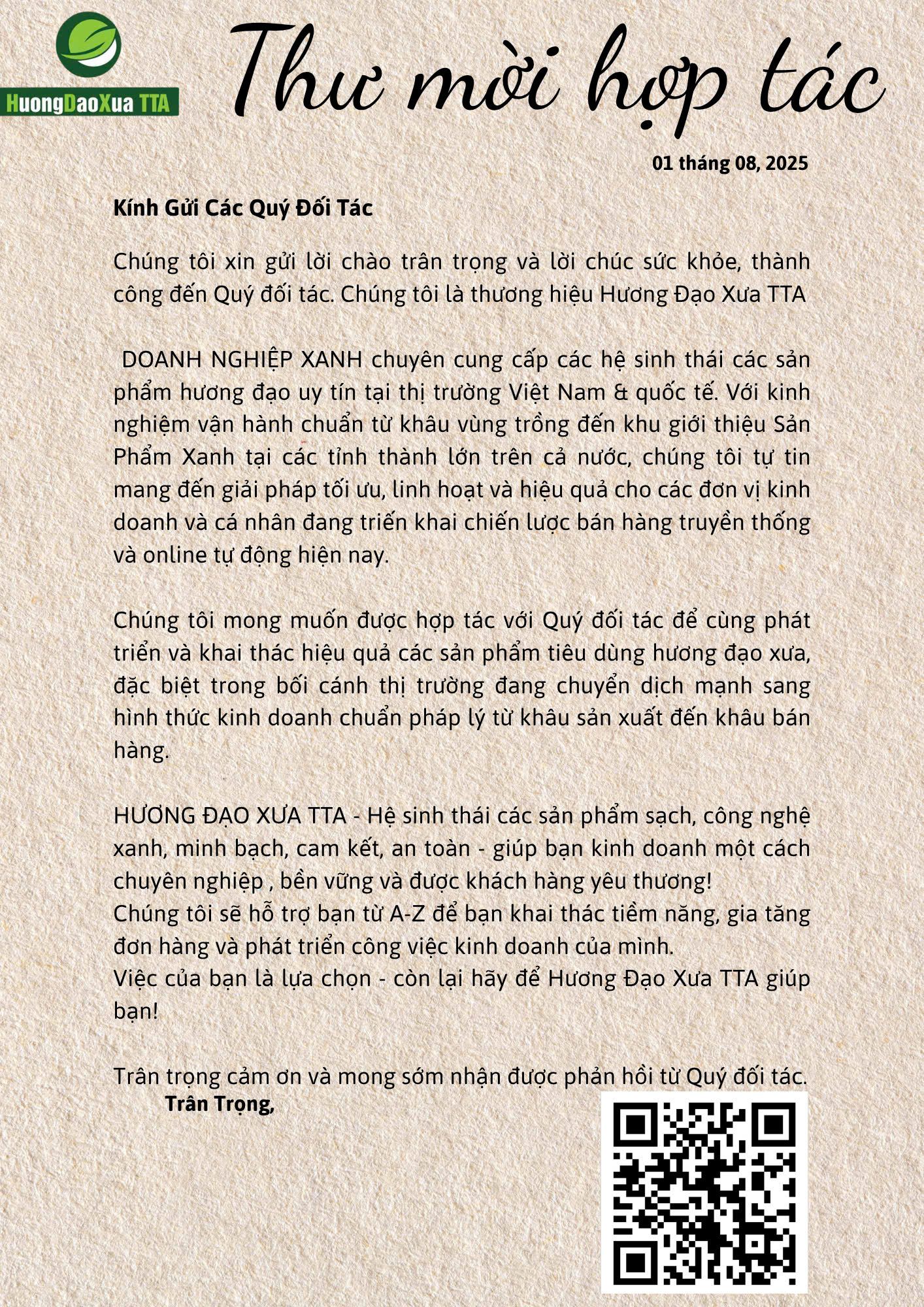 Hệ sinh thái Hương Đạo Xưa TTA trân trọng gửi đến Quý đối tác Thư mời hợp tác kinh doanh, nhằm cùng nhau kiến tạo một cộng đồng kinh doanh sản phẩm xanh – sạch – an toàn và đầy tiềm năng.